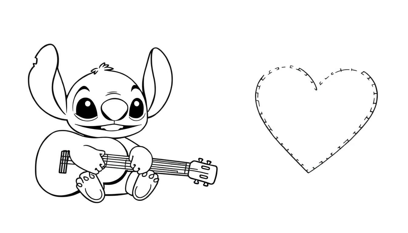 Une page à colorier au trait noir et blanc représentant le personnage de Stitch de Disney assis, souriant et jouant d’une guitare ou d’un ukulélé. À droite, un cœur est dessiné avec des tirets, comme s’il était cousu. Le dessin est simple et prêt à être colorié.