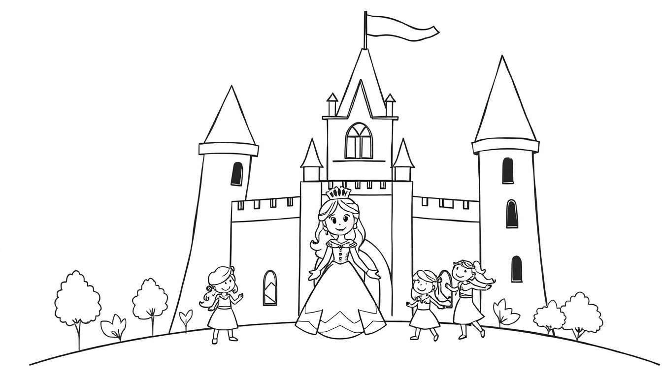 Illustration au trait noir et blanc d’une page à colorier pour enfants. Un grand château de conte de fées trône au centre, avec une tour principale haute et deux tours latérales. Devant le château, une joyeuse princesse couronnée se tient entourée de quatre petites filles jouant. Le paysage est agrémenté de quelques arbres et buissons stylisés. Cette image invite à la créativité avec ses contours nets et son ambiance féérique.