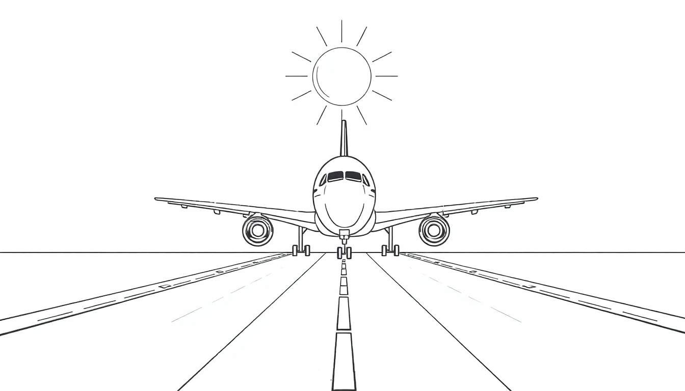 Une illustration simple et amusante pour enfants représentant un avion de ligne vu de face sur une piste d’aéroport, avec un soleil stylisé au-dessus. Idéal pour les passionnés d’aviation et les amateurs de coloriage.