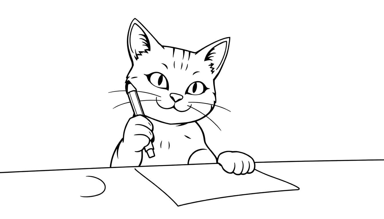 Le style bande dessinée de ce dessin au trait le rend accessible et attrayant pour les jeunes artistes en herbe. Les détails fins, comme les moustaches et les marques suggérant un pelage tigré, ajoutent du caractère au chat, tandis que la simplicité de la table et de la feuille de papier met l’accent sur l’acte de création. C’est une excellente façon d’encourager la motricité fine et l’imagination.