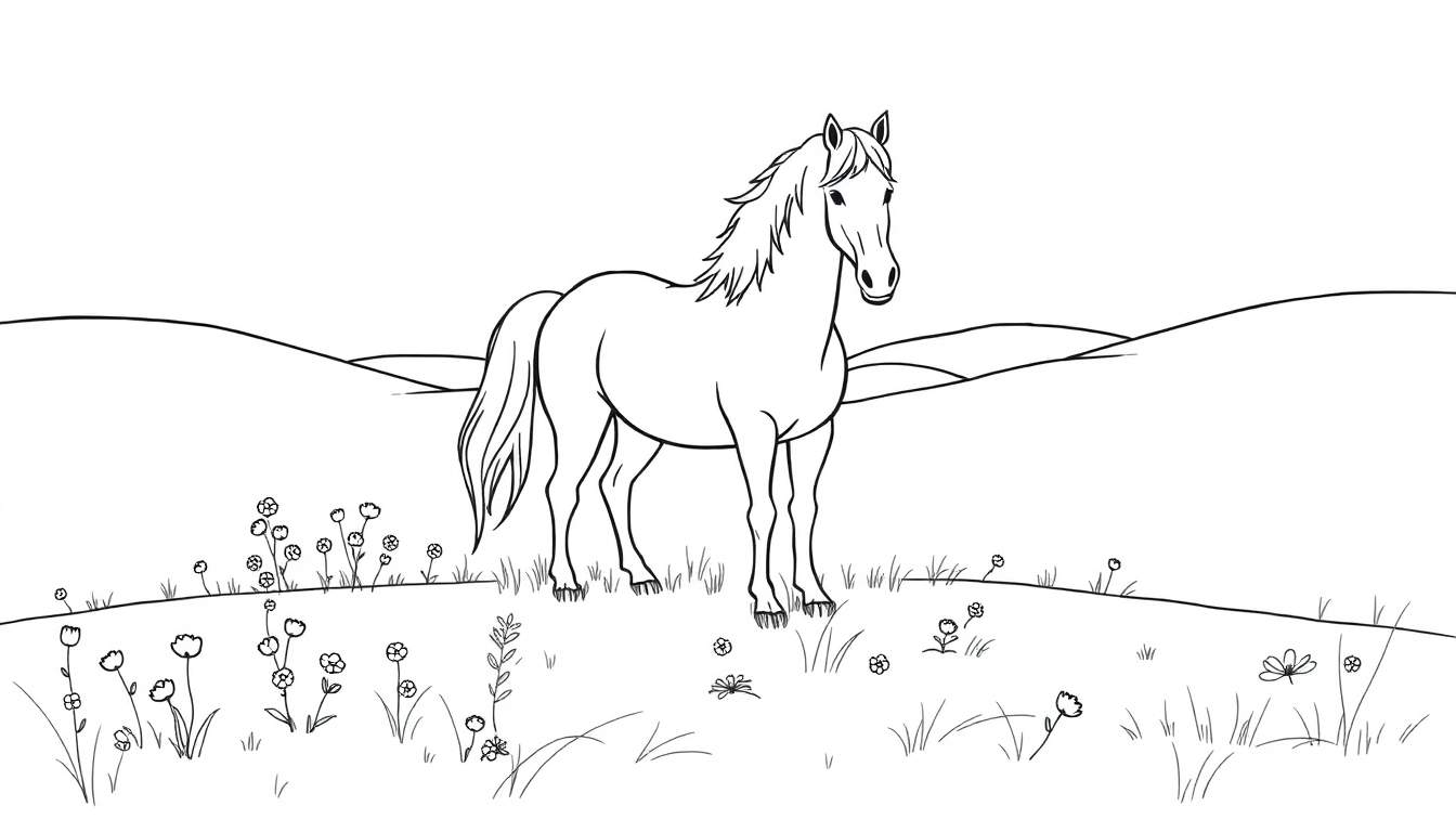 Une magnifique page à colorier en noir et blanc représentant un cheval stylisé se tenant fièrement au milieu d’un pré vibrant de fleurs et d’herbe. Les douces collines en arrière-plan créent un paysage paisible, attendant d’être animées par votre créativité.