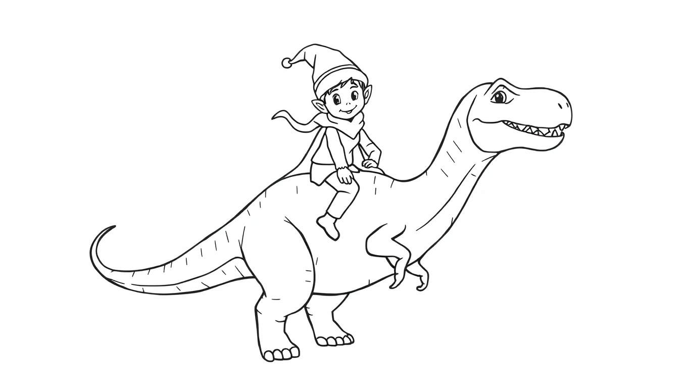 Une page de coloriage unique représentant un dinosaure joyeux, ressemblant à un Tyrannosaure Rex, avec un petit personnage d’elfe ou de lutin assis sur son dos. L’image est un dessin au trait noir et blanc sur fond blanc, idéal pour stimuler la créativité des enfants.