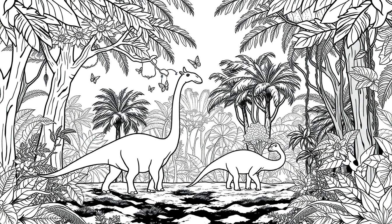 Explorez un Monde Préhistorique : Page à Colorier Dinosaures et Jungle