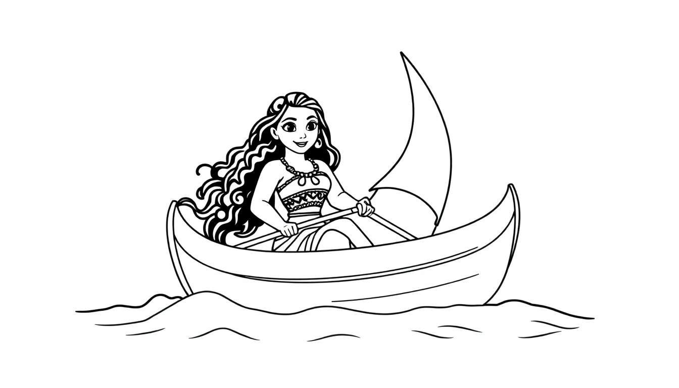 Une page à colorier de style bande dessinée représentant Moana (Vaiana) souriante dans une pirogue, tenant une rame, avec une voile triangulaire et l’eau stylisée en dessous. Ses longs cheveux noirs et bouclés et sa tenue ethnique sont mis en évidence. Idéal pour les enfants fans du film.