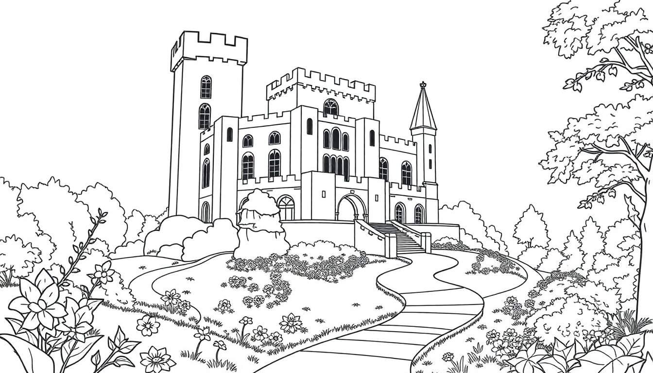 Une page de coloriage détaillée présentant un magnifique château de style européen perché sur une colline, entouré d’un paysage naturel luxuriant avec des fleurs, des buissons et des arbres. Idéal pour les enfants et les adultes.